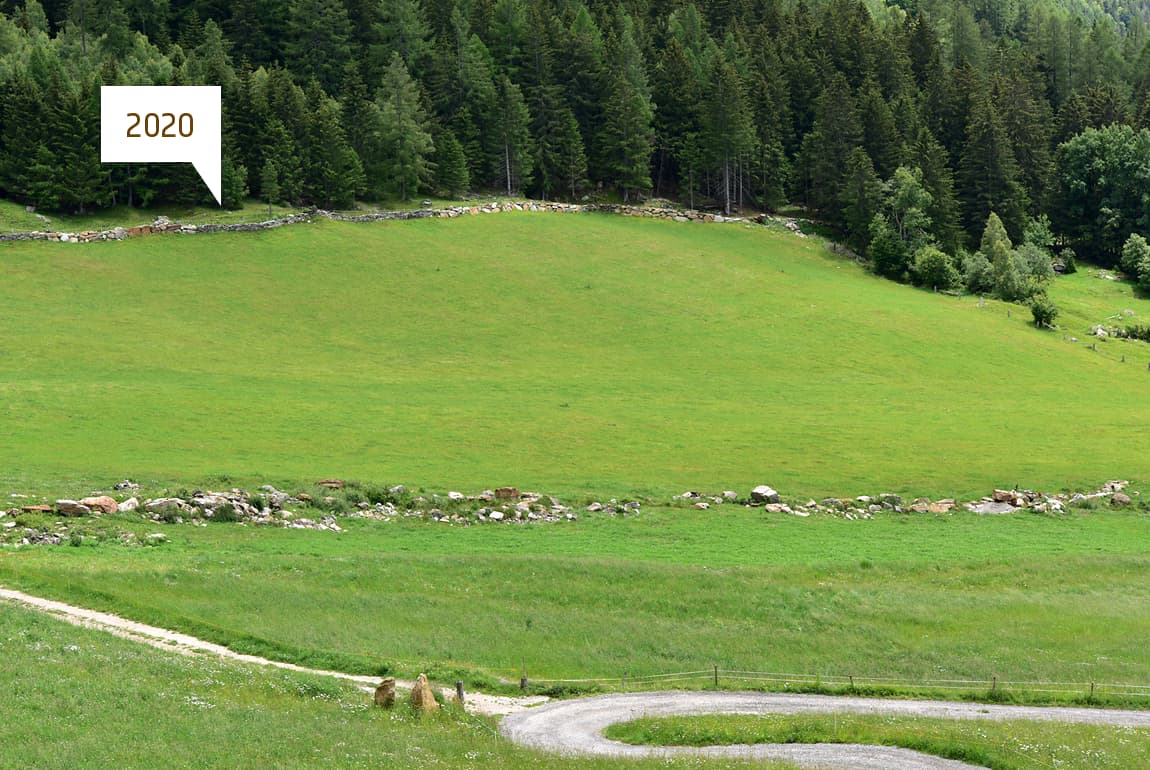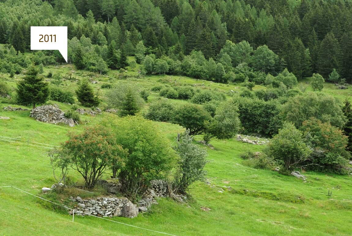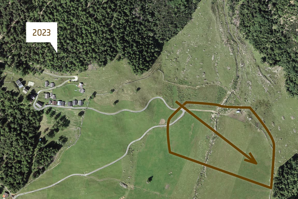 Die besonders betroffene Fläche (rund 5 Hektaren) ist umrandet und wies Vorkommen mehrerer Zielarten der Umweltziele Landwirtschaft auf (Pfeil: Aufnahmerichtung der Fotos).35 Sechs Reptilienarten, die alle nach Bundesrecht geschützt sind, waren hier nachgewiesen. Diese Melioration in den Alpen war kantonal bewilligt und subventioniert. Solche Ereignisse sind starke Treiber des Biodiversitätsverlusts. Sie mögen lokaler Natur sein, aber zusammengerechnet und summiert über die Zeit tragen sie zu einem nationalen Rückgang von Biodiversität bei.