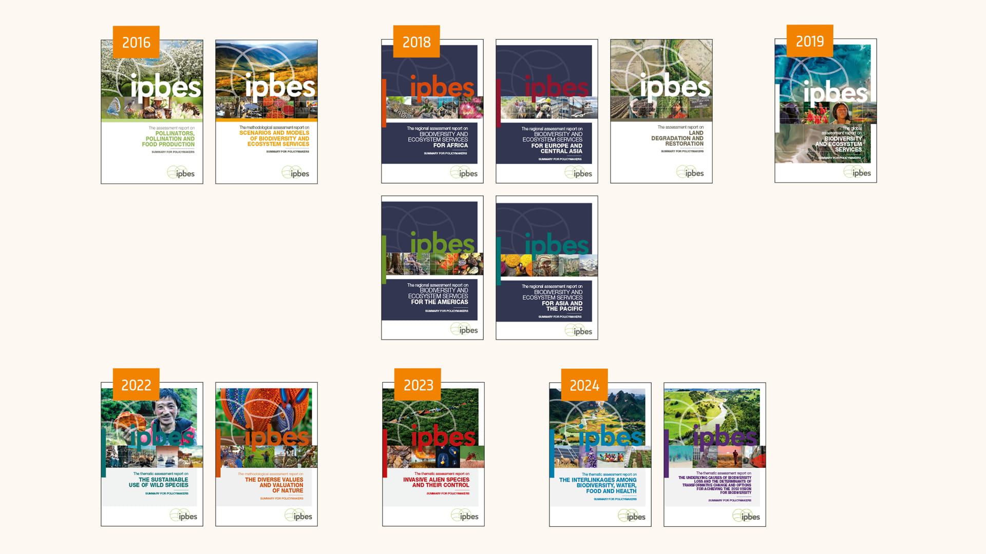 Diversité des thèmes abordés par les rapports du Conseil mondial de la biodiversité (IPBES) jusqu’en 2024. Le premier rapport global a été publié en 2019.67 Source: ipbes.net